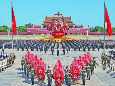 方阵前,以中共中央,全国人大常委会,国务院,全国政协,中央军委,各民主党派、全国工商联和无党派爱国人士,各人民团体和各界群众,老战士、老同志和烈士亲属,中国少年先锋队名义敬献的9个大型花篮一字排开,花篮红色缎带上书写的“人民英雄永垂不朽”格外醒目。