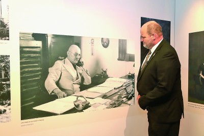 9月29日,在德国柏林中国文化中心,约翰·拉贝曾外孙克里斯托夫·赖因哈特在南京大屠杀主题展览上参观。焦授松供图