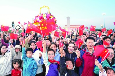 十月一日清晨,隆重的升国旗仪式在北京天安门广场举行,庆祝中华人民共和国成立七十六周年。这是观众在升旗仪式后欢呼。 新华社记者 鞠焕宗摄