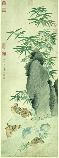 在明代画家陆治的《竹报平安图》中,一对鹌鹑位于显要的位置。在中国传统文化里,“鹌”谐音“安”,因此鹌鹑象征“安全”和“平安”。图中竹子与鹌鹑组合成了“竹报平安”。“竹报平安”是古代的一个成语,意思是报平安的家信。