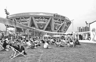 10月1日,中国网球公开赛期间,球迷在位于北京的国家网球中心内的大屏前观看比赛。新华社记者 杜昕怡摄