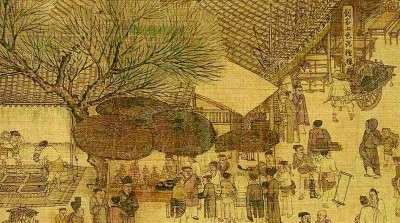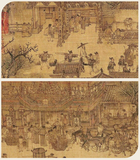 从《清明上河图》上可以清晰地看到,商人比比皆是,商品琳琅满目。汴河两岸店铺林立,街道上游人如织。穿过城门进入内城,更是一派热闹繁华光景。