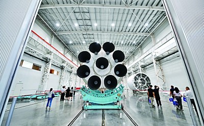 10月9日,星际荣耀运载火箭总装总测复用工厂(一期)竣工仪式在海南文昌举行。据了解,工厂总建筑面积2.88万平方米,用于运载火箭整体装配、测试及重复使用等商业航天项目。图为当日拍摄的星际荣耀运载火箭总装总测复用工厂内设置的双曲线三号运载火箭机械模拟箭。新华社记者 郭程摄