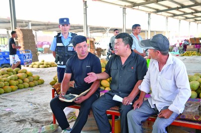 牛羊成群,人声鼎沸。“人群聚集的地方好做生意,也容易滋生纠纷。但是,有纠纷也不怕。”前来卖牛的牧民麦麦提指着一个摊位说,“看,我们这的法官在‘摆摊’呢。”眼前,是巴楚县人民法院“巴扎普法”,吸引了十多个牧民围观。
