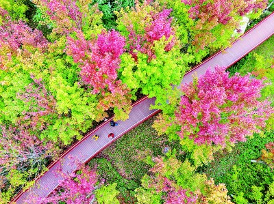 10月9日,陕西省西安市新城区幸福林带的枫叶进入观赏期,红色栈道穿梭掩映在枫林之间,构成一幅秋意盎然的美丽画卷。张成摄/光明图片