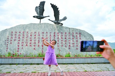 小朋友在位于山西太原汾河畔的雁丘园拍照。新华社发
