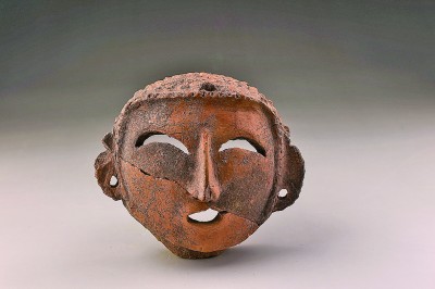其中具有代表性的是陶塑人面像,均为泥质红陶,加工精致。人面像头顶饱满,从后向前以密集戳刺纹表示头发,额顶正中有穿孔,两鬓连至下颌;面部泥条盘筑,两眼镂空呈月牙形;鼻梁贴塑,挺直,略呈鹰钩状;口部镂空微张,呈微笑状;双耳扁平,贴于脸颊两侧,耳垂下方有穿孔耳洞;颈部中空,半弧形。