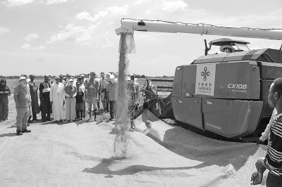 10月初,乍得哈杰尔-拉米斯省杜吉亚区米代金村迎来一年一度的收获季,中国援乍得农技援助项目在此举办“丰收节”。图为10月4日,人们观看收割机作业演示。新华社发