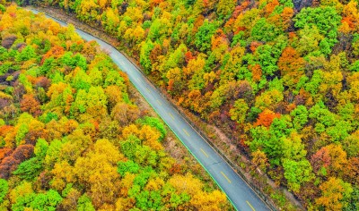 眼下,山西省晋中市左权县孟信垴自然保护区大堡岩境内,层林五彩斑斓,公路蜿蜒伸展,成为金秋太行一道亮丽风景线。邢兰富摄/光明图片
