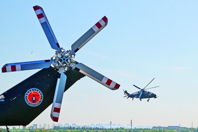 10月14日,第七届中国天津国际直升机博览会举行媒体探馆活动。本届天津直博会将于10月16日至19日在天津空港经济区举行。目前,各项筹备工作已进入冲刺阶段。图为参加飞行表演的直升机进行演练。 新华社记者 孙凡越摄