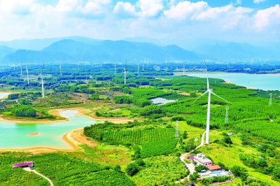 近年来,广西贺州市富川瑶族自治县发挥风能资源优势,大力发展风电产业,助力县域经济发展。图为近日,富川瑶族自治县柳家乡龟石水库边的大唐龙头风电场,风力发电机组群迎风旋转输送绿电。黄胜林摄/光明图片