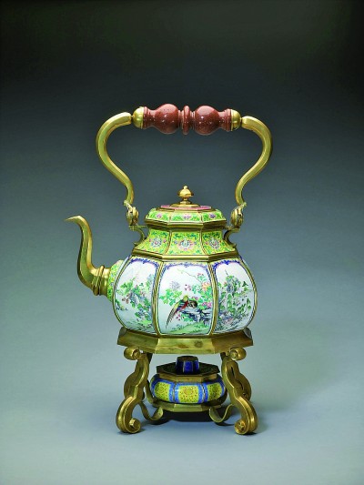 文物无言,却诉说着最生动的文明交流史。清铜胎画珐琅花卉纹提梁壶及温炉,其温炉设计的灵感,来源于欧洲人“温茶”的习惯;而从故宫博物院借展的清乾隆款画珐琅八棱开光山水花鸟图提梁壶,也在造型、风格上与面向西方市场的外销品有异曲同工之妙。