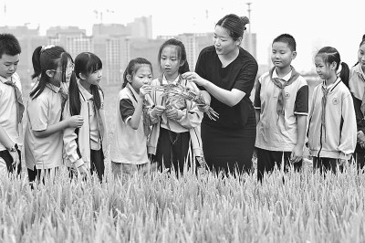 10月15日,江苏省太仓市港城小学老师为孩子们讲解水稻生长知识。新华社发
