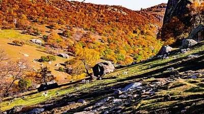 在红山国家森林公园,五颜六色的植被与赭红色的山石相互映衬,吸引大批游客登山赏秋、拍照打卡。