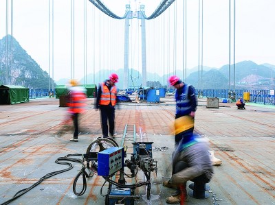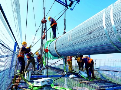 工人们正在安装花江峡谷大桥主缆的巨型“拉环”。