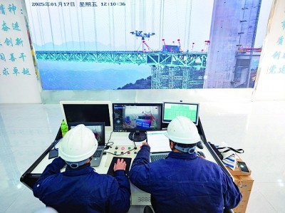 在北斗卫星的精确定位下,花江峡谷大桥最后一个钢梁结构正在进行吊装连接。