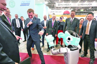 第66届国际机械工业博览会日前在捷克第二大城市布尔诺举行。图为捷克工业与贸易部长卢卡什·弗尔切克在展会上与中国产机器人互动。杨艺明摄/光明图片