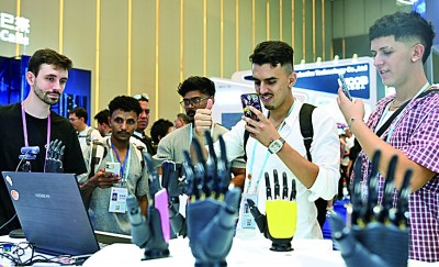 境外采购商在第138届广交会服务机器人专区体验机器手同步动作。新华社发