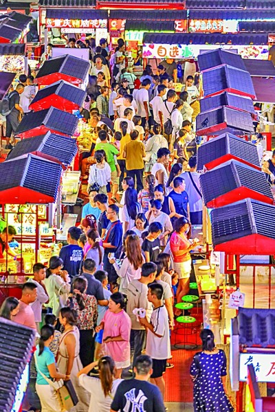 再仔细听,“来一杯冰水降降火”“现切的水果,快来尝一尝喽”,吆喝声、欢笑声、吉他声交织在一起,从街这头一直传到街那头……