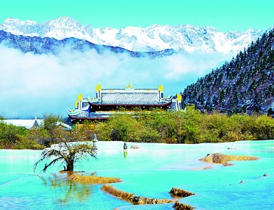 10月21日,四川省阿坝藏族羌族自治州黄龙景区迎来今秋第一场降雪,五彩池与皑皑白雪交相辉映,美不胜收。图为当日拍摄的黄龙景区五彩池一角。新华社发