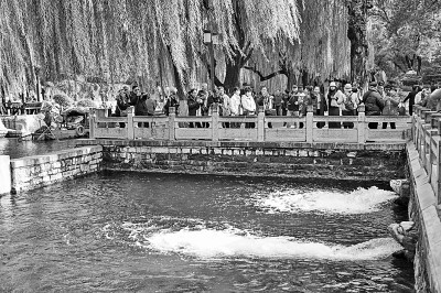 近日,山东省济南市泉水喷涌有力,吸引了众多市民和游客到泉水绿道行走,观赏泉水景观。济南市泉水绿道总长约6.6公里,沿护城河和大明湖公园而建,串联起多个泉水景观和名胜古迹。图为10月22日,人们在济南泉水绿道观看泉水景观。新华社记者 徐速绘摄