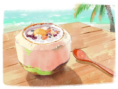炽热的海南午后,穿过老街斑驳的墙影,一间十几平方米的老铺门前,阿公坐在店口,手起刀落,砍开椰子的厚壳,倒出椰子水,再用刨刀将椰肉削成薄片;阿婆站在案前,手脚麻利,把煮好的绿豆、红豆、薏米、芋圆一一添入碗中,再舀上一勺浓稠的椰奶淋在刨冰上,白得发亮,香气袭人。最后撒上一撮炒花生碎,脆香混着乳香,热浪中送来一口透心凉。