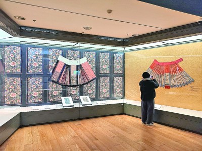 环顾展厅,展品琳琅满目,有“贵妇装”,也有“平民装”,有玄黑、正红的“典雅范儿”,也有湖蓝、浅粉的“小清新”……几位观众在展厅中津津有味地欣赏,不时评论一下服装的针脚细密、绣工精深。