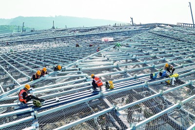 10月27日,西安东站最后一块总重达4800吨的屋盖钢结构桁架顺利提升至33米高空指定位置,标志着西安东站站房主体结构顺利完工。西安东站是集高铁、普铁、地铁、公交于一体的综合交通枢纽,建成投用后车站旅客年发送量预计可达3650万人次。图为当日,施工人员在西安东站站房钢结构顶部进行施工作业。 新华社发