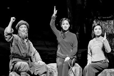 在音乐语汇上,民族歌剧勇于探索,运用更具有系统性的音乐重构法,取得可喜效果。如在《沂蒙山》中,山东民歌《沂蒙山小调》作为核心音乐素材,被拆分化用在多个篇章,让剧中人物的情感更具层次感,也为人物增添了地域特点。在《映山红》的序曲以及《送亲人》唱段中,器乐与声乐结合得极为紧密,营造出极具震撼力的悲剧效果;独唱《你在家乡等我回来》、红军大合唱《告别亲人》更是形成了既有民族底色,又有大交响色彩的声音空间。新创作的《冰山上的来客》,将原歌剧与经典同名电影的音乐融为一体作为该剧的整体基调,其中经典的四声部重唱《今夜没有星光》,根据不同情绪,采取调式转换、弹性节奏的不同处理,让四个不同的声音在这部戏中穿插往复,营造出强烈的艺术感染力。