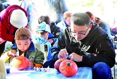 近期,北京世界花卉大观园举办全国精品菊花展、“梦回侏罗纪”巨型南瓜王国展等活动,丰富市民秋日出游选择。图为11月2日,游客在北京世界花卉大观园体验南瓜涂鸦。新华社记者 任超摄