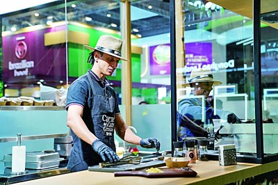 11月4日,工作人员在第八届进博会农食产品展区制作食物。新华社发