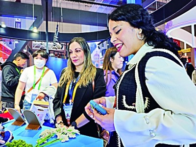 进博会萨尔瓦多展厅,工作人员在推荐当地特色商品。本报记者 范天培摄/光明图片