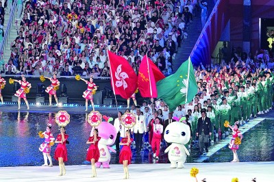 本届全运会东道主广东体育代表团、香港体育代表团、澳门体育代表团同时入场。