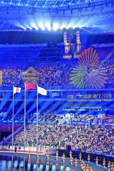 修葺一新的广东奥林匹克体育中心灯火璀璨,照亮夜空。体育场中央被蓝色的舞台和深邃的水流装扮成一个巨大的“同心圆”。在这个流光溢彩的舞台上,现代化艺术手法和创新技术呈现着体育激情与人文温度的交融,大湾区独有的历史与现实交汇于此:从广州“千年商都”的历史文脉,到深圳“春天故事”的开放活力;从香港维多利亚港的现代繁华,到澳门大三巴牌坊的中西交融……这些极具粤港澳大湾区风采的标志性事件和符号,都在开幕式中精彩展现。