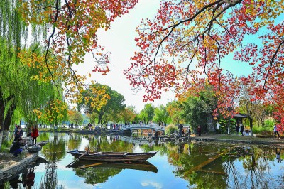 初冬时节,神州大地秋意尚未褪尽,斑斓色彩为初冬涂上一抹别致韵味。图为11月12日,游客在南京莫愁湖公园赏景游玩。新华社发