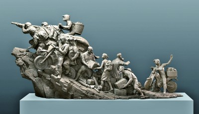 除了聚焦革命历史题材,对于社会热点的关注同样能够拓宽雕塑创作的视野和维度。2022年夏天,重庆的持续高温引发多处山火,面对自然灾害,消防官兵、武警部队、志愿群众以及背着竹篓的摩托大军等两万人接力救援,让世界见证了中国人团结的力量。为了生动展现救援者们的非凡勇气、坚忍意志和家国情怀,学院师生创作了全景式雕塑作品《缙云之巅》。在草图设计之初,创作者们同样进行了资料分析与实地考察。值得一提的是,雕塑中的一名青年油锯手的形象,源自四川美术学院雕塑系毕业生黄佳琦,他志愿参与了缙云山山火的扑救行动。在他看来,此次行动可谓一场“饱和式救援”,“物资是饱和的,志愿者是饱和的,甚至连志愿者们的情绪也是饱和的”。因此,创作者们决定将这种饱满的热情融入雕塑创作,提炼出“普通人”“汇聚”“忘我”等关键词。群雕的最高点为运送救援物资的摩托车手,他的周围有正在奋战的消防员、搬运物资的年轻母亲、疏散人群的青年志愿者等。人物群像组合在一起如山峰一般,共同营造出昂扬向上的动势。该作品荣获2022年重庆市美术作品展金奖,这是创作者们通过观察生活、思考生活、凝练生活,再运用各种雕塑技法倾力创作的成果。在此过程中,教师和同学们也完成了从事件观察者到艺术记录者,再到精神传承者的转变。