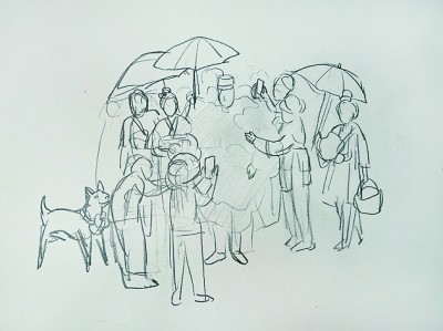 “两个现场+两个空间”的学习,为同学们的创作打下了坚实的基础,而距离真正完成一件场景雕塑作品,还需要创作者充分发挥其想象力与共情力。“场景雕塑”课会重点聚焦革命历史题材雕塑创作,在进行多方研习与考察后,老师先抛出相关主题,并让同学们围绕该主题发挥想象,罗列出“情绪关键词”。如在一次以“南昌起义”为主题的雕塑创作中,一位同学在设计之初列出了“激烈”“昂扬”“力量”“信心”等关键词。接下来,老师便会引导同学将这些复杂的情绪具象化,如跃起的战士代表“激烈”,高举的大刀象征“昂扬”,健硕的战马彰显“力量”等。同学们以此思路绘制草图,重点经营正视面的构图,并以大小不一的泥方块和泥条搭建出作品的空间关系,最终逐步调整为一件完整的场景雕塑。通过这样的训练,雕塑作品的内在情绪与外在形象得以深度融合,不仅具有生动的视觉效果,更能精准传递出丰富的情感内涵。