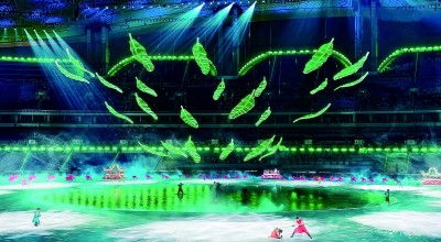 《雨打芭蕉·绿韵岭南》将第十五届全运会开幕式艺术顾问、广州美术学院教授林蓝创作的国画中的芭蕉意象进行立体化、光电化转译,捕捉雨后蕉叶垂露的瞬间弧度,将南国湿润之风凝铸于艺术形态之中。24片巨型“芭蕉叶”依自然之势升降组合,与空中、地面的武术表演节奏呼应,形成“步移景换,人在画中”的沉浸式场景。由此,寻常植物焕发出属于岭南的盎然生意与精神气韵。