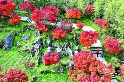 初冬时节,神州大地美景如画。图为11月16日,游客在湖北省宣恩县锣圈岩地质公园的枫林间漫步游玩。新华社发