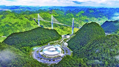 登上332米高、相当于110层楼高的观景之地,如同站在云端。一拨一拨的游客用手机记录下自己与平塘大桥近在咫尺的瞬间。