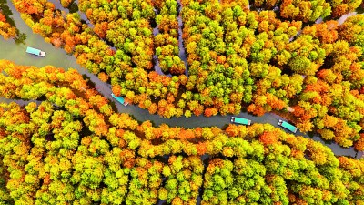 初冬,安徽宁国方塘乡青龙湾,红杉林迎来最佳观赏期,吸引各地游客泛舟林间。李晓红摄/光明图片