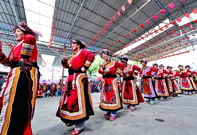 11月18日,四川省阿坝藏族羌族自治州茂县赤不苏镇举行特色民俗文化活动,当地群众身着传统民族服饰,与游客一起载歌载舞、品尝咂酒、共话丰收,喜迎一年一度的羌历新年。图为当日,在茂县赤不苏镇,当地群众在跳萨朗舞。新华社记者 江宏景摄