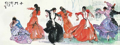 对中国传统画学的再认识,促使杨之光奔赴敦煌临摹古代壁画。他不仅遵循传统画学的“形神兼备”准则去学习壁画,更以西方解剖学知识研究古人对动物形体的把握,展现出人物画家的独特视角。敦煌之行也让他获得没骨画法的启示——在写实基础上,适当的夸张与变形会使形象更为传神。这推动他在艺术生涯后期通过大量舞蹈题材探索没骨技法,融合书法用笔与写意花卉设色,使肌理、色彩与光感一笔成形,画面流畅精到、充满律动感。可以说,杨之光至此已突破新中国成立初期“徐蒋体系”水墨画模式偏重素描、形象稍显拘谨、缺乏水墨意趣的局限,形成了个人的风格。
