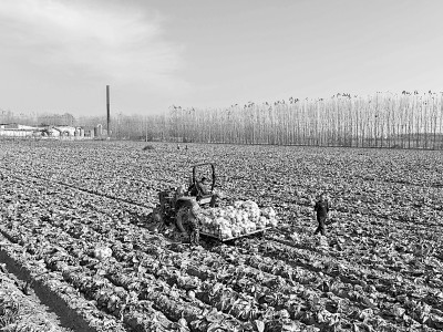 11月22日,小雪节气,山东省聊城市农民抢抓农时做好田间管护、采收等工作,一派忙碌景象。图为农民在聊城市茌平区振兴街道蔬菜种植基地收获甘蓝。马红坤摄/光明图片