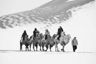 11月23日甘肃省敦煌市迎来立冬以来首场降雪。当地著名景点鸣沙山月牙泉银装素裹,景色如画。图为游客在鸣沙山月牙泉景区游览。