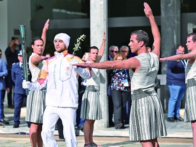第一棒火炬手、希腊运动员彼得罗斯(前左)传递火炬。 新华社发