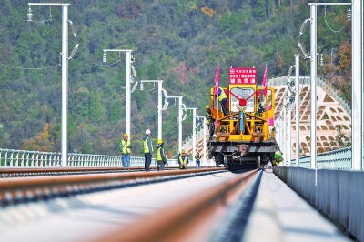 11月27日,在湖北十堰神定河特大桥上,西安至十堰高速铁路全线最后一对长钢轨铺设落地,标志着西十高铁全线铺轨工程顺利完工,为后续联调联试奠定了基础。图为当日,工人在神定河特大桥上施工。新华社记者 杜子璇摄