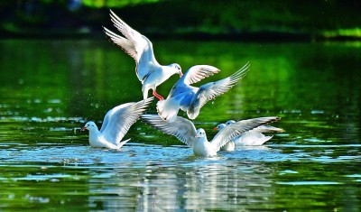 11月28日,云南省红河哈尼族彝族自治州弥勒市湖泉生态园,一群红嘴鸥在水面觅食、嬉戏,吸引游人驻足观看。普佳勇摄/光明图片