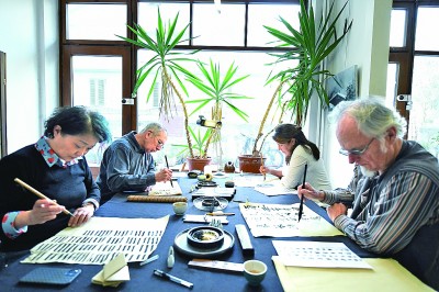 11月19日,在瑞士日内瓦,“乐鱼亭”书法工作室的学员在练习书法。新华社发