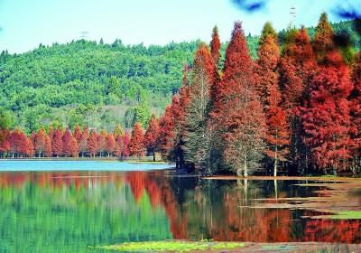 近日,云南省昆明市西山区三家村水库水杉树木色彩依旧斑斓。新华社发